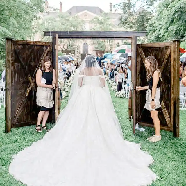 Our beautiful rustic wedding ceremony doors and walls allow privacy before the grand entrance or use as a backdrop. With two working 36″ x 80″ solid oak doors and attached 48″ x 74″ walls, you get a combined 14′ of privacy. The glass knobs add a vintage feel to these doors and are sure to wow your guests. The walls can be decorated to give the feeling of a home or church.