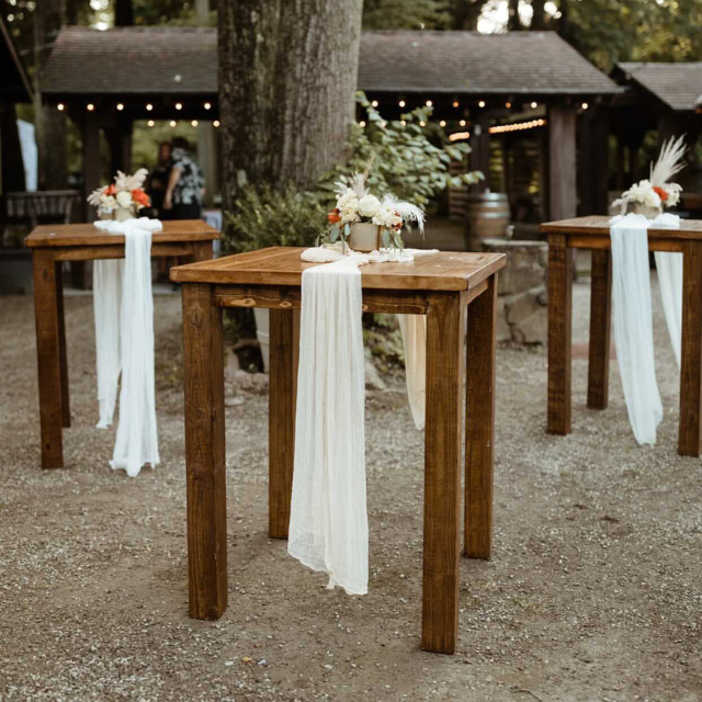 Our high-top tables can be used for gathering around during the cocktail hour or as a cake or dessert table. These beautiful pub tables have the same rustic farmhouse style matching our dining and sweetheart tables. Also looks great in front of our bars. Table is 40″ high with a 30″ square top.