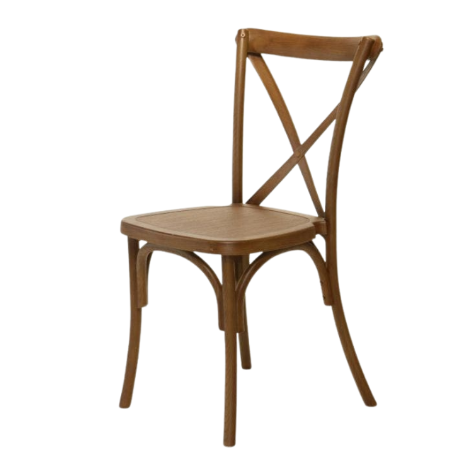 Enhance the charm of your rustic event with our exquisite cross back chairs, also known as x-back or farm chairs. These chairs make for a perfect complement to our handcrafted farmhouse tables, adding an enchanting touch of countryside elegance to your decor.