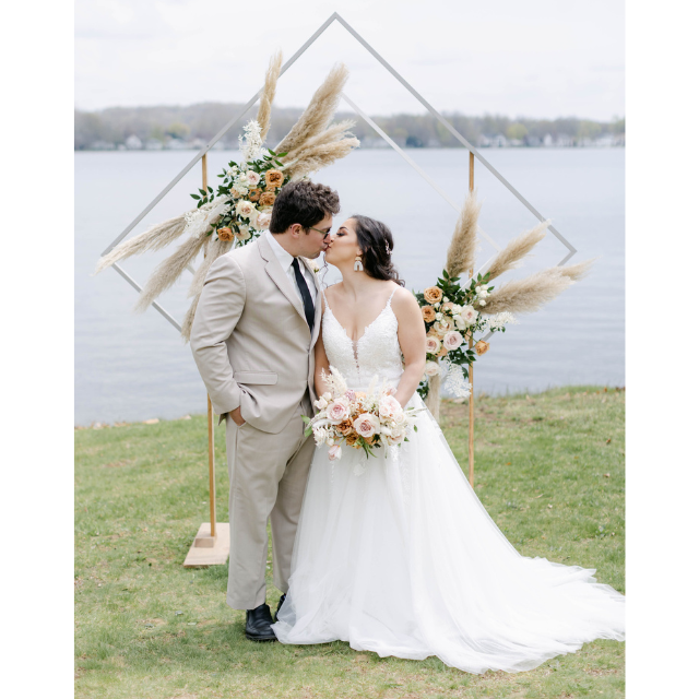Whether you choose to adorn it with flowers or let its refined design shine on its own, this backdrop creates a captivating photo opportunity and adds a touch of timeless elegance to your special occasion.
