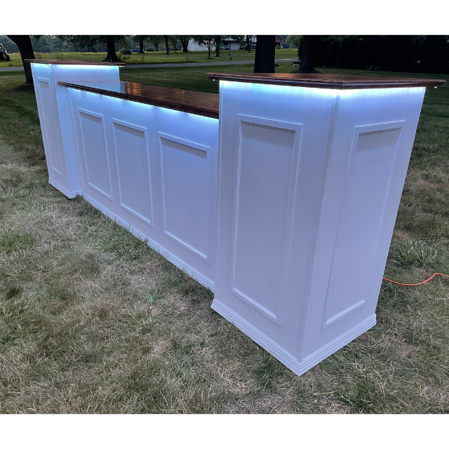 Need a huge bar for a huge event? We have made something special just for you. This beautiful, elegant portable bar is 11’6″ long, the end pillars are 50″ high. We named it the “Executive” because “Awesome” just doesn’t sound classy enough for this guy.
