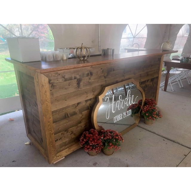 Beautiful, classy, portable rustic wooden two level wet bar with sink. Your event will look awesome during the day and when the lights go down as the front of the bar is illuminated with white led lights, the serving side with blue. At 7’6″ wide, this bar can easily handle large crowds with one or more bartenders. We gave this bar a vintage feel to match our pub and dining tables.