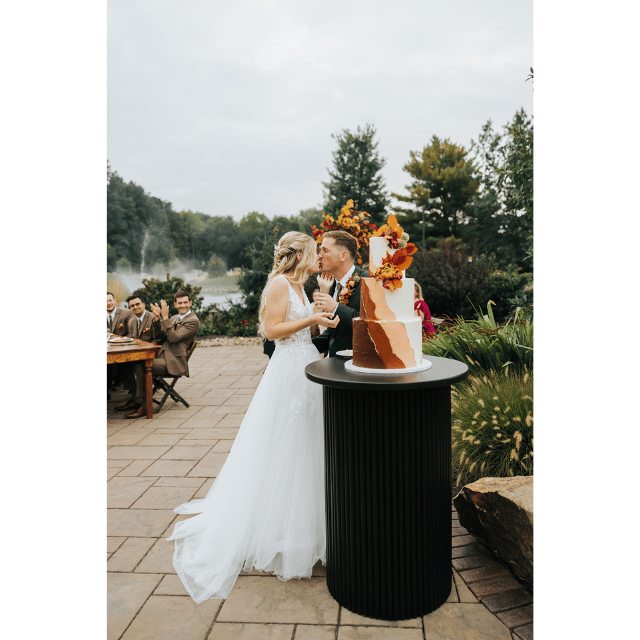 Indulge in sophistication with our new, exquisitely handcrafted round midnight cocktail table. Designed to impress, this stunning piece is perfect for creating a captivating cake table or adding a touch of elegance to your cocktail hour. The modern dowel base not only enhances the table’s aesthetic appeal but also serves as a conversation starter among your guests at any event.