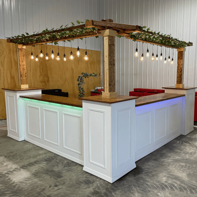 We named this the “ultimate bar”, made it for the huge, ultimate party. This beautiful, elegant bar comes in two flavors, as one very long bar or in an L shape. Both allow multiple bar tenders to keep the party going.