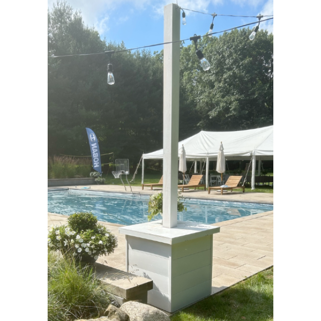White shiplap light poles for wedding reception lighting offer a rustic and modern aesthetic that can complement a variety of wedding themes. The shiplap design adds texture and interest to the poles, while the white coloration creates a sleek and sophisticated look. The use of poles for lighting can create a warm and cozy ambiance for guests, while also providing practical illumination for the reception area. Overall, white shiplap light poles can be a stylish and functional choice for wedding reception lighting. These can be placed anywhere and can use string, bistro, or globe lights.